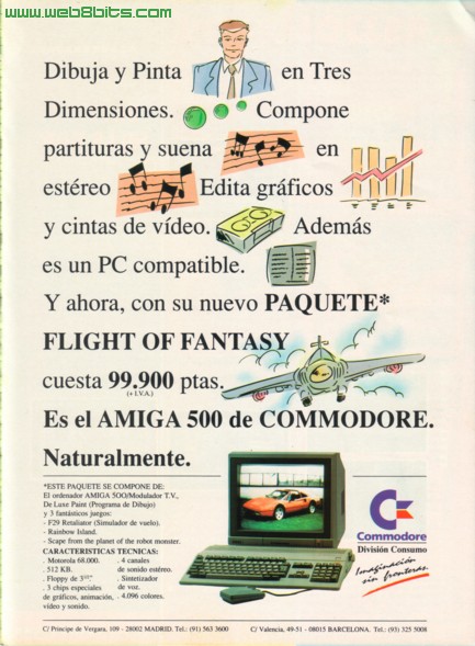 Ordenador Amiga 500 Publicado na revista Amiga World Nº 13 Data: Setembro 1990 Comentarios: Anuncio do Amiga 500, facendo fincapé nas suas posibilidades multimedia, son estereo, dibuxo 3D, edición de video. Ademais se dí que é compatible PC o cal non e exactamente certo. Para que o Amiga 500 executase os programas do PC MS-DOS precisábase dun Software de emulación, un dos mais coñecidos era o Transformer, que era terriblemente lento, ainda que moi efectivo; aindo recordo emular o Lotus 123 no meu Amiga 500 con iste programa, ou dunha placa hardware que incorporaba un PC no seu interior, emulación perfecta e rápida pero cara. Nista ocasión Commodore regalaba un pack de software chamado Flight of Fantasy, composto polo Deluxe Paint e tres xogos, F29 Retaliator, Rainbow Islands e Scape from the Planet of the Robot Monster. Coma sempre Commodore cometeu o erro de anunciar as suas máquinas en revistas que maioritariamente ian mercar poseedores de Amiga, en vez de publicalo anuncio en outras revistas doutras plataformas, como fixo Atari anunciando o Atari ST nunha revista tipica de Spectrum, a Microhobby ou nunha mais xeneralista como a MIcromania. |