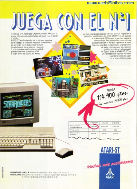 Ordenador Atari 520 STfm Publicado na revista MicroHobby nº 188 Data: Maio 1989 Comentarios: Anuncio do Atari 520 STfm, moi similar ao xa publicado por Atari en Novembro de 1988, nesta ocasión o anuncio compara o precio con dous dos seus rivais, o Amiga 500 e o Sinclair PC 200. Unha vez mais Atari publica o seu anuncio nunha revista de ordenadores de 8 bits, consciente de que os seus usuarios tarde ou temprano darían o paso cara as máquinas de 16 bits. |