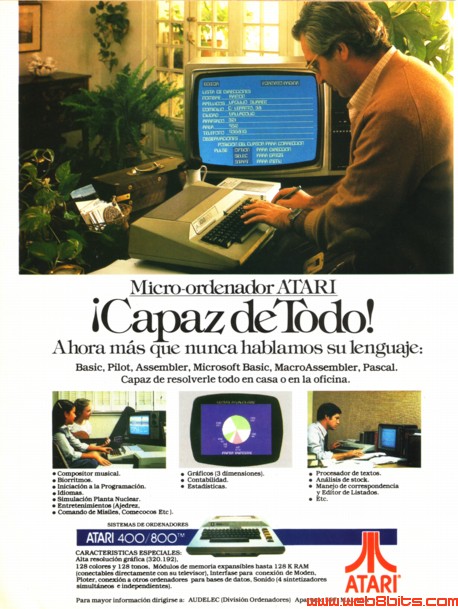 Publicado na revista MUY Interesante nº 20 Data: Xaneiro 1983 Comentarios: Un dos primeiros anuncios dos microordenadores Atari en España, publicado nunha revista xeneralista de información científica, Muy interesante. O anuncio fai fincapé nas posibilidades serias dos ordenadores Atari, linguaxes de programación avanzadas como PILOT ou Assembler, posibilidades de xestión, e unha pequena referencia aos xogos; ainda que no anuncio so aparece a foto do Atari 800 tamén fai referencia ao Atari 400. É interesante ver como xa se anuncia o Microsoft BASIC, xa que por aqueles anos, principios dos oitenta, estábase a convertir no standard. Vinte anos despois Microsoft segue sendo o Standard, pero agora en outros campos. |