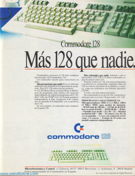 Ordenador Commodore 128 Publicado en la revista Commodore Magazine Nº 26 Fecha: Abril 1986 Comentarios: Anuncio de la primera máquina de 128 KB. de Commodore, el C=128, el anuncio hace hincapié en la posibilidad de ejecutar los programas del C=64 y además executar programas CP/M, lo que hacía de esta máquina la de mayor biblioteca de Software disponible. El anuncio da a conocer los detalles técnicos de la máquina |