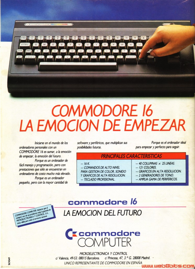 Ordenador Commodore 16 Publicado na revista Commodore World 13 Data: Marzo 1985 Comentarios: Commodore lanzou o Commodore 16 como unha alternativa ao VIC 20 que deixara de fabricarse, por iso na publicidade di que é para escomenzar na informática, xa que era o ordenador de mais baixas prestaciones da linea de Commodore. Foi un fracaso comercial debido a incompatibilidade tanto de Hardware como de Software co modelo que trataba de sustituir, o VIC 20. |