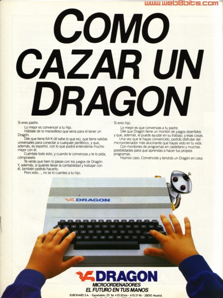 Ordenador Dragon 64 Publicado en la revista MUY Interesante Nº 42 Fecha: Noviembre 1984 Comentarios: Anuncio del ordenador Dragon 64, cuando este ya era fabricado por la empresa española EuroHard, anuncio muy sencillo, donde la única parte gráfica corresponde a una fotografía del ordenador, el resto del anuncio lo compone la frase publicitaria "Como cazar un Dragon", haciendo un juego de palabras entre el nombre del ordenador y el mítico animal, y después hay un texto donde se exponen las razones por las que se debería comprar el ordenador, desde el punto de vista del padre y desde el punto de vista del hijo. El anuncio hace referencia en varias ocasiones a que es un ordenador español y que mucho Software está en español. |