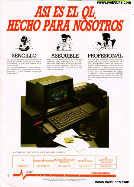 Ordenador Sinclair QL Publicado na revista Micromanía Nº 11 Data: Abril 1.986 Comentarios: Segundo anuncio do QL publicado por Investrónica na revista Micromanía, anuncio que tentaba resaltar as posibilidades profesionais do Sinclair QL a un precio moderado, pódense ver os precios das distintas configuracions que ofrecía Investronica do QL na parte de abaixo do anuncio. |