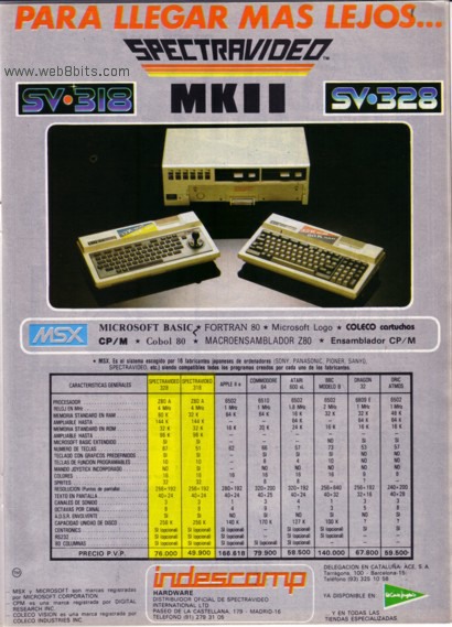 Ordenadores Spectravideo SV 318 SV 328 Publicado na revista ZX Nº11 Data: Outubro 1984 Comentarios: Anuncio publicado na revista ZX dos ordenadores MSX Spectravideo, é un dos poucos anuncios que fixo Spectravideo dos seus ordenadores, é un anuncio moi técnico e fai unha comparativa, incluindo precios, dos seus competidores. Destacar que iste ordenador estaba distribuido pola mesma distribuidora dos Amstrad, Indescomp, de ahí que non recibira demasiado apoio xa que Indescomp centrouse rapidamente e en exclusiva nos Amstrad |