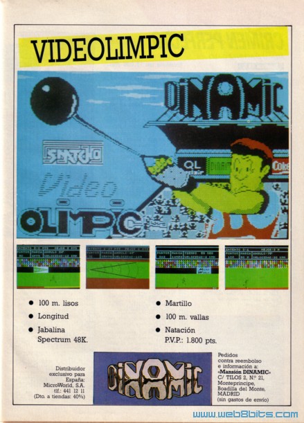 Dinamic VideoOlimpic Distribuido por: MicroWorld, S. A. Plataforma Spectrum Publicado en la revista Micro Hobby Nº 8 Fech: Diciembre 1984 Comentarios: Anuncio del juego de Dinamic Video Olimpic, como nota curiosa se puede observar como el anuncio llama al programa Videolimpic, con solo una o, y que en la pantalla de carga aparece como Video Olimpic, con dos oes. El anuncio está muy en la linea de los primeros anuncios de Dinamic, muy sencillos, el anuncio en sí es la pantalla de carga del juego y además aparecen cuatro pantallas del juego. El precio de 1800 ptas, 10,82 Euros, era algo más barato que los juegos de importación que andaban en torno a las 2300 ptas., 13,83 Euros. Un par de años más tarde, en 1986, este juego fue distribuido en el Reino Unido por MasterTronic en su linea de software barato, y ocupó durante muchas semanas el número uno de ventas en el Reino Unido. |