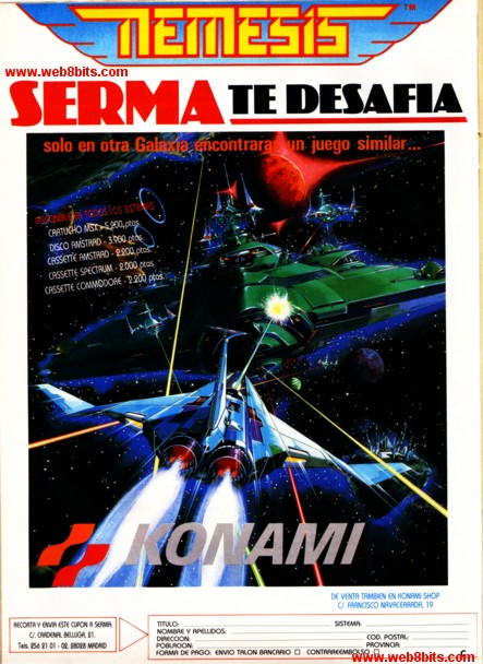 Konami Nemesis Distribuido por Serma Plataforma Spectrum, Amstrad, Commodore e MSX Publicado na revista MicroManía Nº 22 Data: Abril 1987 Comentarios: Anuncio do xogo Nemesis, Serma foi a distribuidora de Konami en España e trouxo os mellores cartuchos de xogo para o MSX, neste caso trátase dun xogo moi bó de arcade, o precio da versión MSX, en cartucho, era de 5900 ptas., moitos cartos para a época, iste foi un dos motivos polo que o MSX non chegou a triunfar, o bó software viña en cartucho e istes eran caros. |