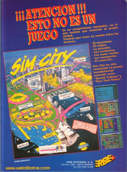 Maxis Sim City Distribuido por: Erbe Software Publicado en la revista Amiga World nº 9 Fecha: Abril 1990 Comentarios: Anuncio de uno de los clásicos del Software de simulación, el Sim City, saga que aún continua hoy en día con el Sim City 4, secuela del Sim City 3000 y del Sim City 2000. El anuncio hace referencia a que esto no es un juego, es un simulador, y para hacer más hincapie en el hecho de que esto es algo serio, aparecen las reseñas de los comentarios hechos en la prensa mundial, como el New York Times o el Herald Tribune. Las pantallas que aparecen en el anuncio corresponden a la versión Amiga y el anuncio nos dice que hay versiones para Amiga, Atari y PC, es decir las máquinas de 16 bits más importantes de la época, aunque es importante decir que este simulador fue desarrollado en un Macintosh y que por lo tanto, aunque no comercializada en el Estado Español, existió una versión para Mac de este simulador. Un tiempo más tarde aparecieron las versiones para máquinas de 8 bits como el Spectrum. |