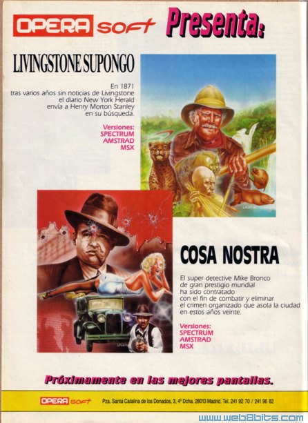 Opera Soft Cosa Nostra + Livingstone Supongo Distribuido por Opera Soft Plataforma Spectrum, Amstrad, e MSX Publicado na revista MicroManía Nº 18 Data: Nadal 1986 Comentarios: Anuncio dos xogos Cosa Nostra e Livingstone Supongo da compañía de Software española Opera Soft, iste é o anuncio dos seus dous primeiros proiectos, o anuncio non mostra ningunha pantalla do xogo e se limita a un par de debuxos e un escueto resumo da historia de cada un dos xogos |
