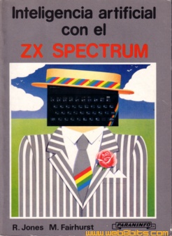 Título: Inteligencia artificial con el ZX Spectrum Autores: R. Jones e M. Fairhurst Título orixinal: Artificial Intelligence: ZX Spectrrum Traductor: Luis Campoy Guillén ISBN: 84-283-1488-8 Ano publicación: 1986 Páxinas: 188 Tamaño: 15,5 x 21,5 cm. Editorial: Paraninfo, S.A. Idioma: Español Precio orixinal: 6,67 ¤ Comentario: Libro de gran calidade e moi técnico, empeza explicando os prinicipios básicos da intelixencia artificial e vai avanzando explicando o recoñecemento de patrons, de voz, mallas e patrons visuais, etc., e todo elo aplicado ao Sinclair Spectrum, con programas en BASIC onde se aplica o explicado |
