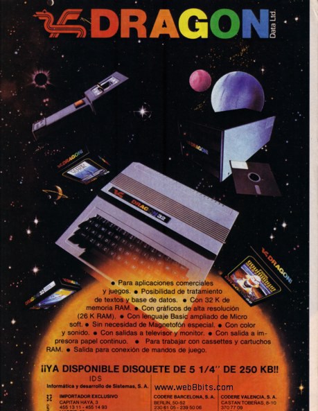 It was a relative sucesfully in England because it was compatible with Tandy computers, in fact so many people said that Dragon was a copy of Tandy models, in Spain it wasn´t any sucessfully, eclipsed by Spectrum and Commodore 64 computers. it was a very limited hardware to be considereded a good game machine, it hasn´t sprites, the graphic mode only offer two colors in high resolution (256 x 192), and it has only one voice sound controled by CPU, as a serious machine it has a limited text mode with only 16 rows by 40 colummns, insufficient for a serious normal work although it has a 175 Kb. 5,25" disk drive in option.
